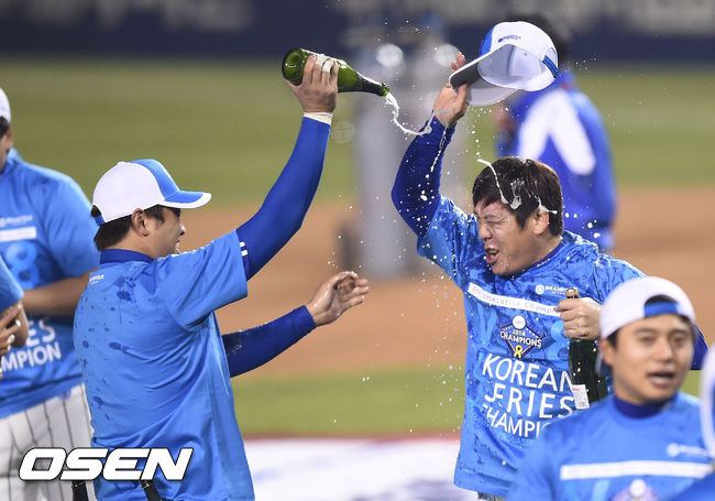 한국시리즈 우승으로 통합 4연패의 대기록을 세운 삼성 선수들이 동료들과 샴페인 세리머니로 기쁨을 나누고 있다./ sunday@osen.co.kr