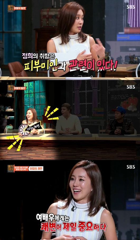 문정희는 “일상생활이 무너져서 체질개선을 시작했다”며 “쾌변을 위해 짜고 매운 것들을 없애고 몸에 좋은 것들만 먹기 시작했다. 여배우에게는 쾌변이 가장 중요하다”고 말해 웃음을 자아냈다.