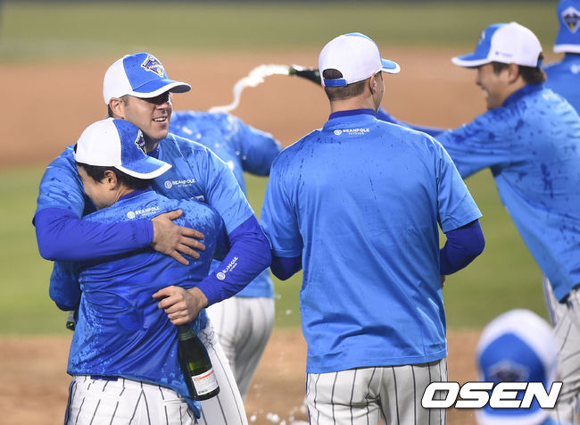 한국시리즈 우승으로 통합 4연패의 대기록을 세운 삼성 선수들이 동료들과 샴페인 세리머니로 기쁨을 나누고 있다./ sunday@osen.co.kr