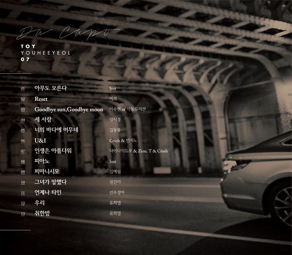 토이의 소속사 안테나뮤직은 12일 총 13트랙이 수록되는 ‘다 카포’의 트랙 리스트를 공개했다. 이번 앨범은 기존에 비해 여성 보컬의 비중이 늘었으며, 친근한 이름 대신 새로운 얼굴의 아티스트가 대거 포진했다는 특징을 갖는다. 화려한 객원가수 군단 사이에서 ‘우리’, ‘취한 밤’ 등 총 2곡의 가창자로 나선 유희열의 이름도 눈에 띈다.