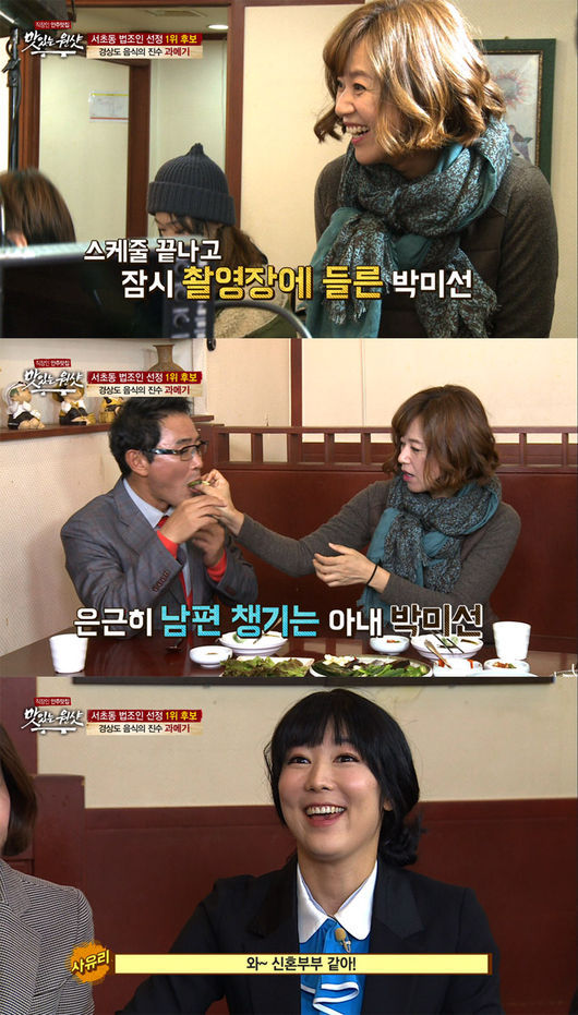 평소 어떤 남편이냐는 사유리의 질문에 박미선은 “평소 입이 까다롭다”면서도 직접 쌈을 싸서 이봉원에게 먹여주는 등 연예계 대표 잉꼬부부다운 애정을 과시했다. 사유리는 “신혼부부 같다”며 부러운 눈빛을 보내기도 했다.