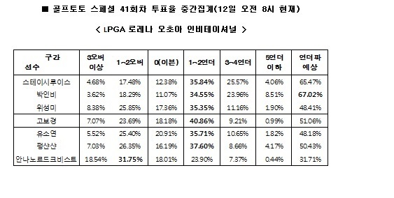 스테이시 루이스가 65.47%로 두번째 높은 언더파 지지율을 기록했고 고보경(51.06%)과 펑샨샨(50.43%)이 뒤를 이었다. 반면 위성미(48.41%), 유소연(48.18%), 안노 노르드크비스트(31.71%)의 언더파 예상은 다소 낮을 것으로 예측됐다.