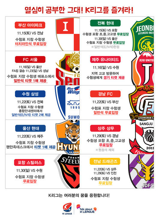 K리그 클래식 대부분 구단들이 2014 수학능력시험을 치른 수험생들을 위해 K리그 경기를 즐길 수 있는 혜택을 제공한다.