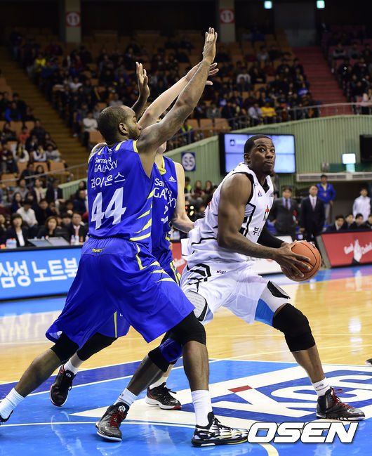 12일 오후 서울 잠실실내체육관에서 열린 삼성 썬더스와 KT 소닉붐의 경기, 2쿼터 KT 로드가 삼성 리온 라이온스를 상대로 슛 페이크를 시도하고 있다.