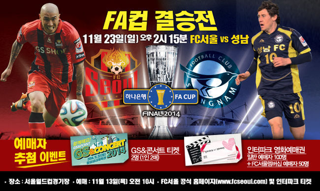 FC서울과 성남FC(이하 성남)가 펼치는 2014 하나은행 FA컵 결승전 티켓 예매가 13일 오전 10시부터 시작된다.