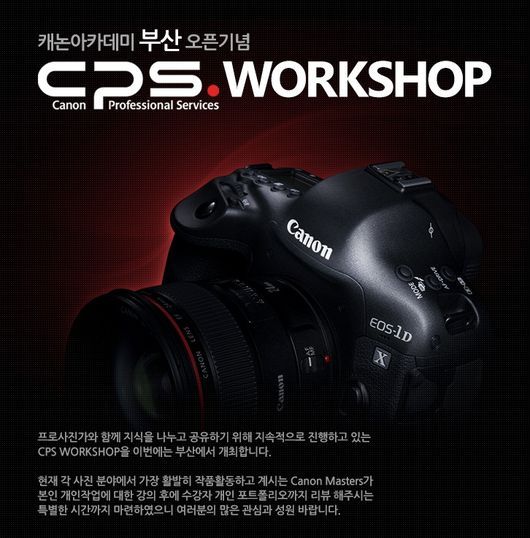 'CPS(Canon Professional Services) 워크숍'은 프로사진가를 지원하기 위한 캐논의 활동인 CPS 프로그램에서 지속적으로 진행하고 있는 행사로 프로사진가들이 모여 사진 촬영 지식 및 기법을 서로 나누는 공유의 장이다. 이번에 새롭게 문을 연 '캐논 아카데미 부산'에서 펼쳐지는 CPS 워크숍은 현재 한국 사진 문화 발전을 위해 가장 활발히 작품활동을 펼치고 있는 '캐논 마스터즈 ' 소속 사진 작가 3명을 초청해 프로 사진 작가는 물론 일반인을 대상으로 워크숍을 진행할 예정이다.