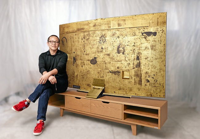 삼성전자는 현대 미술가 홍성용 작가와 협업해 ‘TV에 대한 기억’을 주제로 금박을 입힌 커브드 UHD TV의 뒷면에 벽화처럼 이미지를 표현했다. 보존성이 높은 옻칠로 마감해 소중한 기억을 보존하겠다는 의도를 담아 전 세계에 하나밖에 없는 예술 작품 TV를 제작했다.