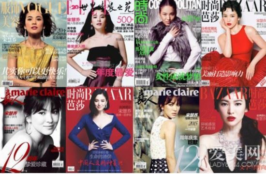 13일 중국 연예매체 런민왕은 "송혜교는 할리우드 배우 사라 제시카 파커(Sarah Jessica Parker) 이후 두번째로 중국 5대 여성잡지에 모두 실린 해외스타"라고 소개했다.