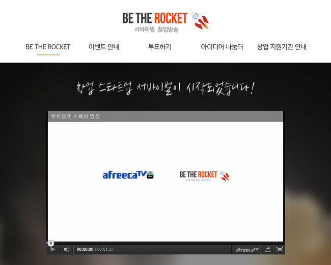 ‘아프리카TV’는 서울대학교 기술지주회사가 주최하는 창업지원 프로그램 ‘비더로켓(Be the Rocket)’에 대한 특집페이지(http://startup.afreeca.com)를 오픈하고, 총 3개월에 걸쳐 진행되는 서바이벌 프로그램에 대한 다양한 지원에 나선다고 13일 밝혔다.