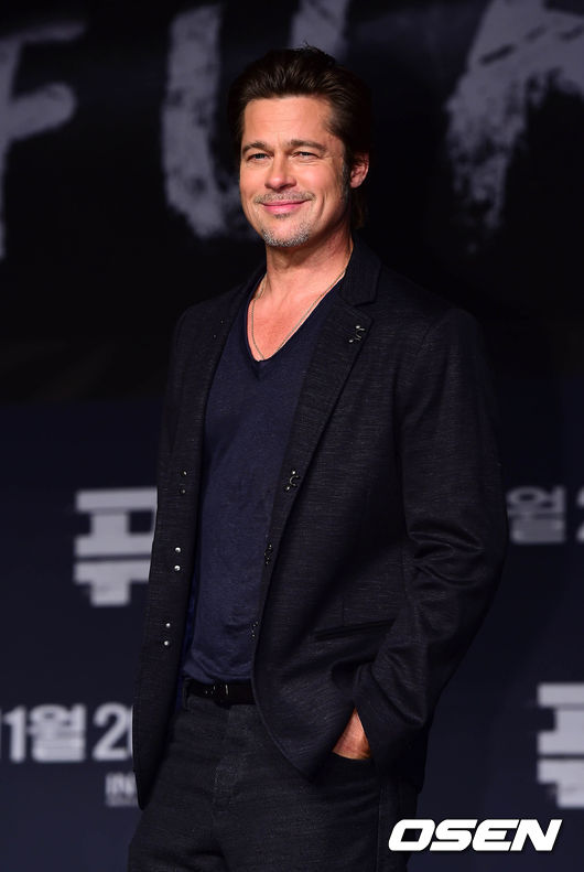 13일 오전 서울 여의도동 콘래드 서울호텔에서 열린 영화 '퓨리' 내한 기자회견에서 브래드 피트가 포토타임을 갖고 있다.