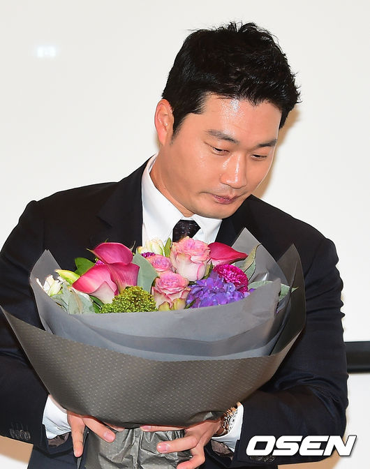 오승환이 기자회견에 앞서 꽃다발을 건네 받고 있다.
