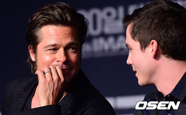 13일 오전 서울 여의도동 콘래드 서울호텔에서 열린 영화 '퓨리' 내한 기자회견에서 브래드 피트가 로건 레먼과 이야기를 나누고 있다.