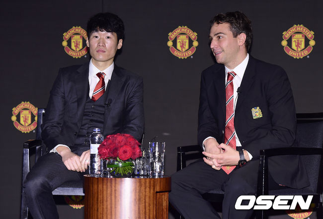맨유 앰버서더 박지성과 맨유 아시아 사장 제이미 리글이 질의응답 시간을 갖고 있다.