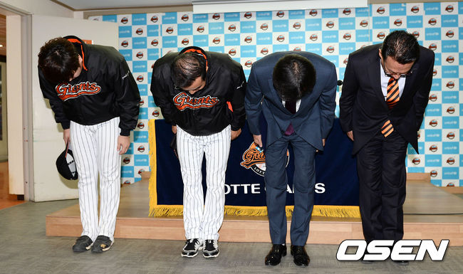 기자회견에 참석한 롯데 박준서, 이종운 감독, 이창원 대표이사, 이윤원 단장이 고개 숙여 사과를 하고 있다.