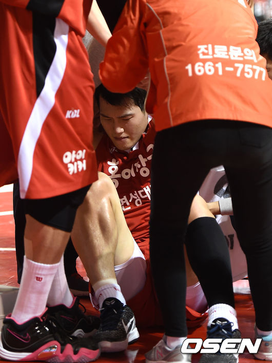 2쿼터 충돌로 부상은 당한 KGC 최현민이 들것에 실려 나가고 있다.