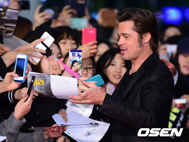 13일 오후 서울 영등포 타임스퀘어에서 열린 영화 '퓨리' 레드카펫 행사에서 브래드 피트가 사인을 해주고 있다.