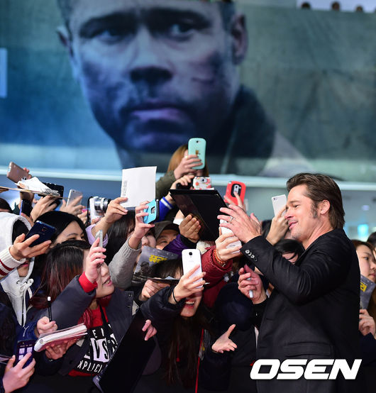 13일 오후 서울 영등포 타임스퀘어에서 열린 영화 '퓨리' 레드카펫 행사에서 브래드 피트가 팬들과 사진을 찍고 있다.