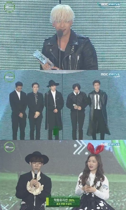 ▲TO10=2NE1, EXO, god, WINNER, 걸스데이, 비스트, 씨스타, 아이유, 악동뮤지션, 태양(이상 가나다순) ▲신인상=위너 ▲네티즌 인기상=비스트 ▲댄스 남자=블락비 ▲댄스 여자=에이핑크 ▲핫트렌드=소유X정기고 ▲발라드=MC더맥스 '그대가 분다'▲포크=악동뮤지션 ▲R&B소울=플라이투더스카이 '너를 너를 너를' ▲랩 힙합=산이 레이나 '한여름밤의 꿀' ▲송라이터상=김도훈 ▲OST=린 '마이 데스티니' ▲MBC뮤직 스타상=레이디스코드 ▲뮤직비디오=멜로디데이 '어떤안녕' ▲인디뮤지션=스탠딩에그 ▲올해의 아티스트상=아이유 ▲올해의 앨범상=god ▲베스트송상=태양