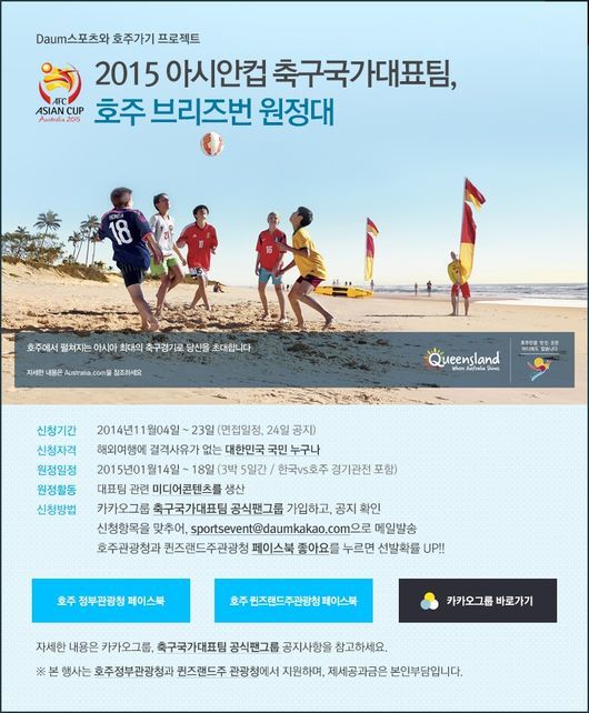 호주정부관광청, 호주퀸즈랜드주 관광청, 다음카카오가 함께 진행하는 이번 프로모션에서 원정대원으로 선발되면, 한국vs호주 예선경기 일정이 포함된 5일간(2015.01.14~18) 아시아 최대 축제로 꼽히는 AFC 아시안컵의 뜨거운 응원 열기를 현지에서 직접 체험할 수 있다. 또한 대한민국 국민들에게 축구 국가대표 선수들의 선전을 비롯한 다양한 현장 소식을 실시간 생중계로 전해줄 수 있다.