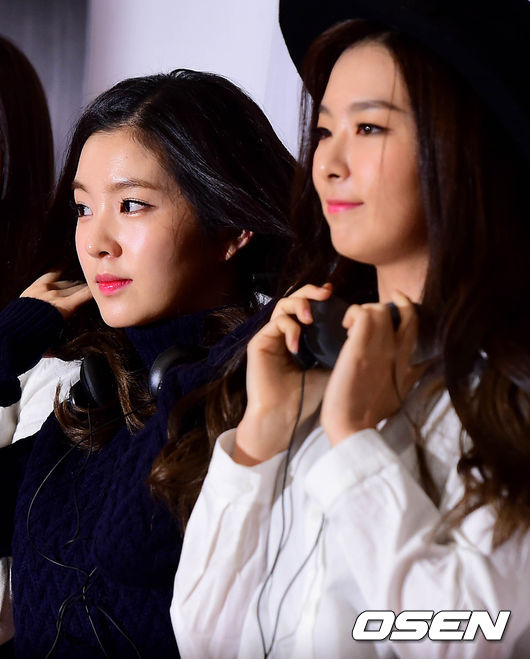 걸그룹 레드벨벳 아이린과 슬기가 발표회에 참석해 포즈를 취하고 있다.