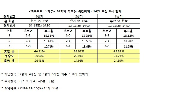 K리그 클래식 3경기 대상 축구토토 스페셜+ 62회차 투표율 중간집계 결과