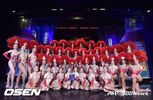 [OSEN=사진팀] 프랑스 파리의 명물 ‘물랑루즈’ 댄서들이 7일(현지시간) 프랑스 파리에 위치한 물랑루즈 카바레에서 화려한 공연을 펼치고 있다. 무용수들이 캉캉춤을 추면서 발차기를 30초간 연속으로 하는 세계기록에 도전 하고 있다.