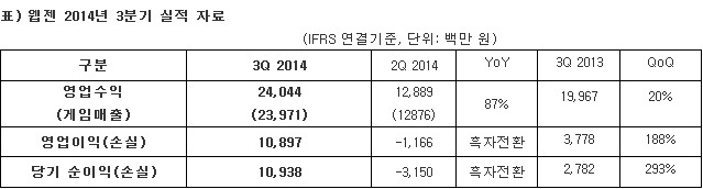 전 분기(2014년 2분기) 대비로는 매출은 87% 성장했고 영업이익과 당기순이익은 흑자 전환했다. 웹젠은 기존 서비스게임들의 대규모 업데이트 및 마케팅활동에 더불어 국내외에서 게임 비즈니스모델을 다양화면서 국내와 해외사업에서 모두 실적을 반등시켰다고 설명했다.