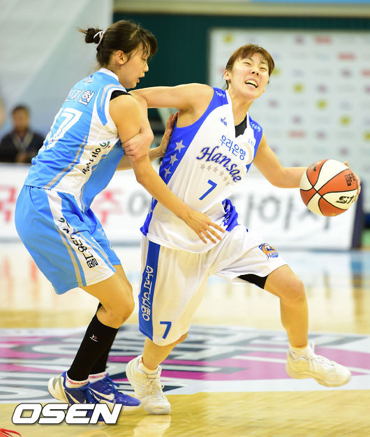 2쿼터, 하나외환 신지현이 우리은행 박혜진에게 파울을 범하고 있다.