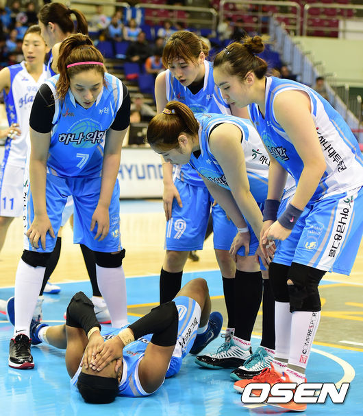 3쿼터, 우리은행 휴스턴의 파울로 쓰러진 하나외환 심스가 코트에 누워 고통을 호소하고 있다.