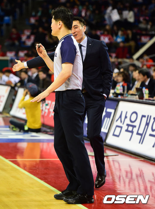 3쿼터 삼성 이상민 감독이 심판에 가벼운 어필을 하고 있다.