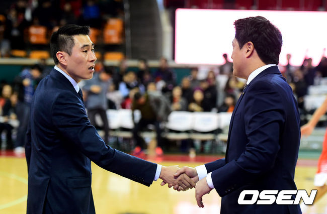 경기후 삼성 이상민 감독과 SK 문경은 감독이 인사를 나누고 있다. /jpnews@osen.co.kr