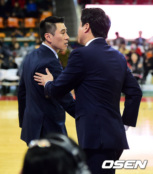 경기후 삼성 이상민 감독과 SK 문경은 감독이 인사를 나누고 있다. /jpnews@osen.co.kr