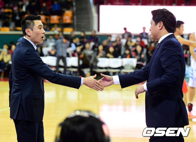 경기후 삼성 이상민 감독과 SK 문경은 감독이 인사를 나누고 있다. /jpnews@osen.co.kr