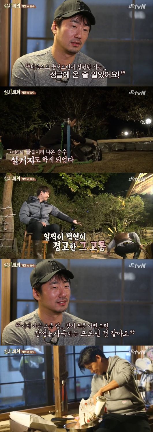 14일 오후 방송된 케이블채널 tvN '삼시세끼'에는 택연이 대학원 중간고사로 자리를 비운 가운데, 류승수가 새로운 게스트로 출연했다.