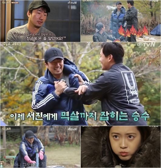 이에 이서진은 “말 같지 않은 소리 그만하고 어서 불이나 붙여”라고 응수, 수제비 반죽을 두고 또다시 유치한 말다툼을 시작했다. 이렇게 이서진과 하는 말마다 되받아치며 티격태격하던 류승수는 “우리가 남자여자였으면 벌써 헤어졌다”고 말하며 한숨을 내쉬어 웃음을 자아냈다.
