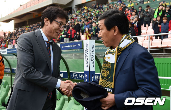 경기에 앞서 포항 황선홍 감독과 전북 최강희 감독이 악수를 나누고 있다.