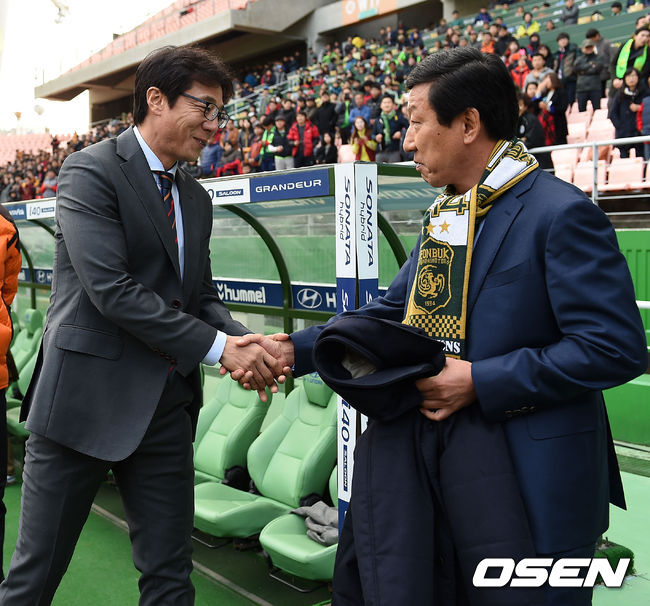 경기에 앞서 포항 황선홍 감독과 전북 최강희 감독이 악수를 나누고 있다.