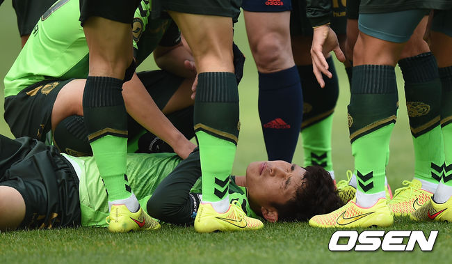전반 전북 이승기가 볼다툼 중 포항 선수와 충돌 후 고통스러워하고 있다.