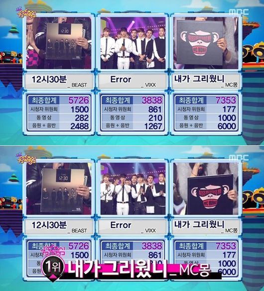 MC몽은 15일 오후 방송된 MBC 가요프로그램 ‘쇼! 음악중심’에서 신곡 ‘내가 그리웠니’로 비스트, 빅스를 꺾고 1위를 차지했다.