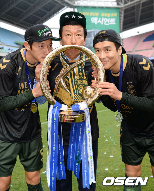 시상식에서 전북 김남일, 최강희 감독, 이동국이 우승 트로피에 키스를 하고 있다. /sunday@osen.co.kr