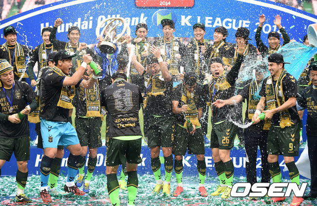 시상식에서 전북 최강희 감독을 비롯한 선수들이 샴페인 세리머니를 펼치고 있다. /sunday@osen.co.kr