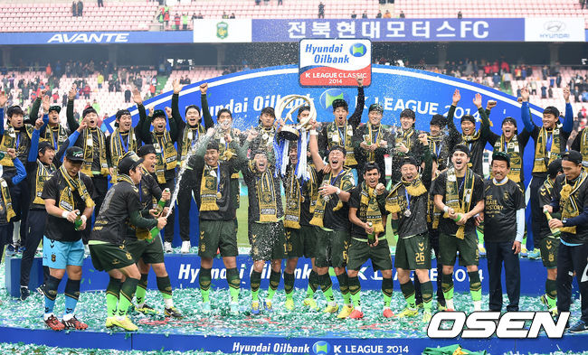 시상식에서 전북 최강희 감독을 비롯한 선수들이 샴페인 세리머니를 펼치고 있다. /sunday@osen.co.kr