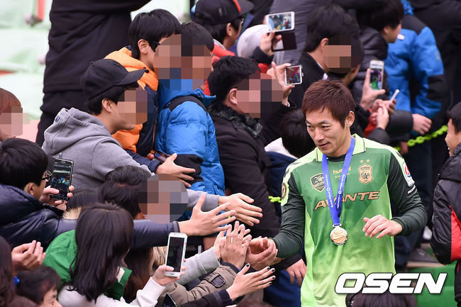 시상식에서 전북 김남일이 팬들과 하이파이브를 하고 있다. /sunday@osen.co.kr