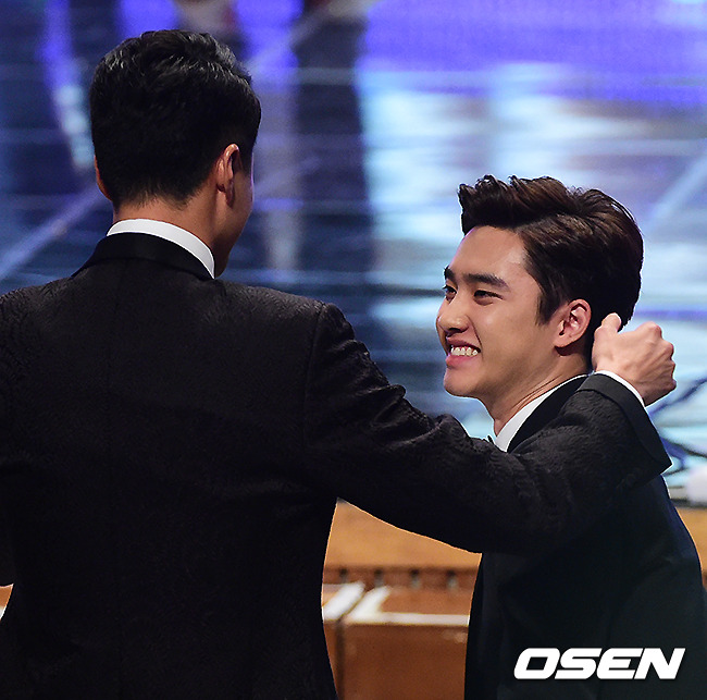 엑소 디오(도경수)가 신인상을 수상하며 조인성의 축하를 받고 있다.