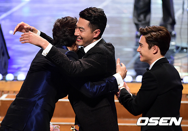 조인성이 대상의 영예를 품에 안았다. 엑소 도경수(디오), 이광수가 조인성을 축하해주고 있다.