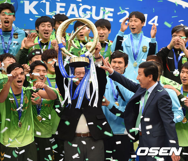 시상식에서 전북 김충호 사장이 트로피를 들고 환호하고 있다. /sunday@osen.co.kr