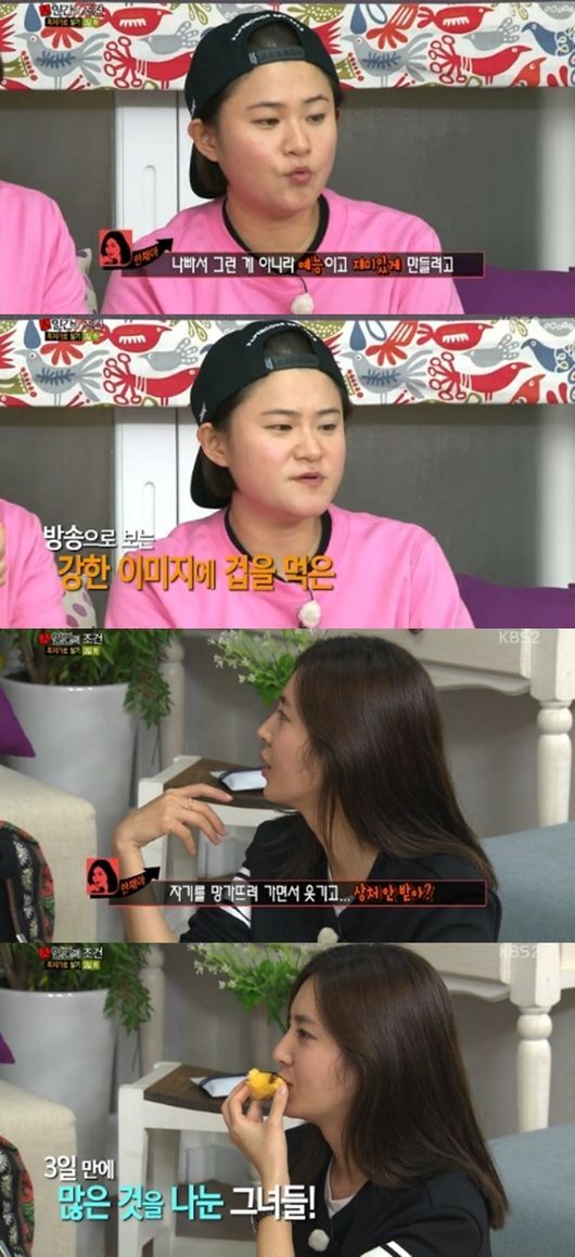 한채아는 “이렇게 예쁜 애들이 어떻게 자기를 망가뜨려가면서 웃기는지, 상처 받지 않을지 궁금하다”고 했고 김신영은 “직업이다”라고 답했다.