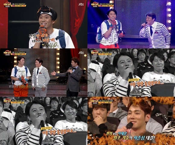 이재훈과 환희의 신경전은 무대가 진행될수록 더욱 팽팽해졌다. 환희는 앞서 무대에 선 이재훈 모창 능력자의 무대를 보고 굳은 얼굴이었다. 얼굴까지 닮았는데 노래 역시 이재훈과 매우 흡사하게 부르며 함성을 이끌어낸 것. 두 사람은 계속해서 서로를 견제했다.