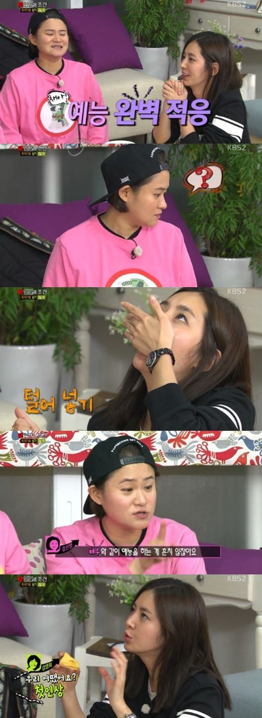 이어 한채아는 “지금은 너무 여리고 예뻐서 내 동생 삼고 싶다. 이렇게 예쁜 애들이 어떻게 자기를 망가뜨려가면서 웃기는지, 상처 받지 않을지 궁금하다”고 했고 김신영은 “직업이다”라고 답하면서 이들 배우와 개그우먼 사이에 흐르던 어색함을 모두 지우고 한 집에 사는 절친으로 발전한 모습을 보였다.
