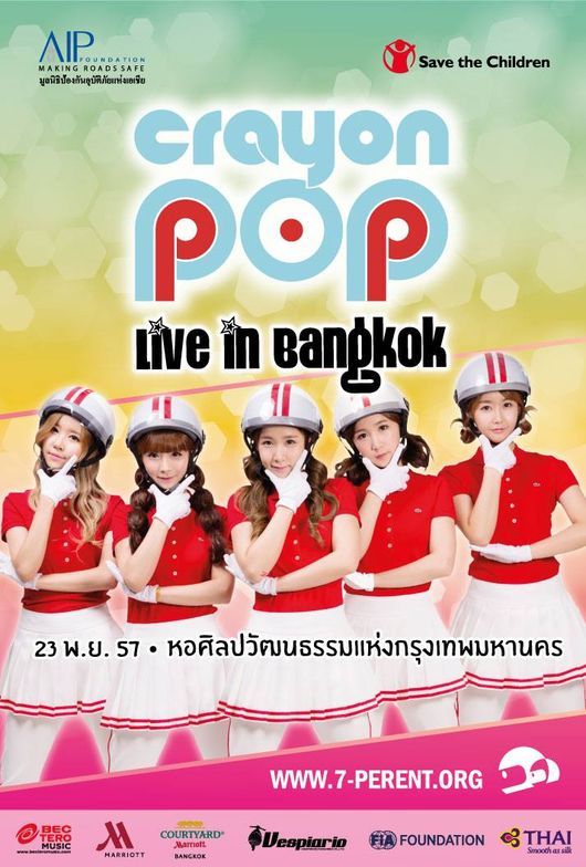 크레용팝은 이 캠페인을 위해 오는 22일부터 24일까지 3일간 태국에 머물면서 라이브 공연은 물론 각종 이벤트와 방송출연, 매체 인터뷰를 통해 헬멧 쓰기 운동을 적극적으로 펼칠 예정이다.